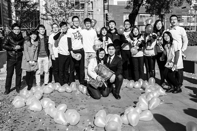 11月24日中午11点40分,在金融街的街心花园广场,中国电信翼支付公司一职工在同事的帮助下向心爱的女友求婚成功。