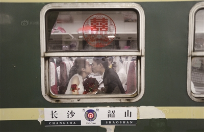 11月16日,湖南韶山,50对新人乘坐“韶山一号”列车前来,在韶山毛泽东广场的毛泽东铜像前参加红色集体婚礼。据悉,“我的婚礼在韶山”从2011年开始举办,2014年通过一个多月的招募,超过600对新人报名,大大超过往届报名人数。