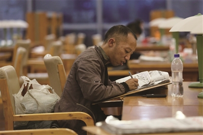 从一年前开始,重庆籍拾荒者陈虎几乎每天下午都会坐在阅览室里读报,并用圆珠笔将部分内容抄到自带的报纸上。陈虎今年36岁,一年前来到杭州打工,却始终没能找到合适的工作,索性捡起了垃圾。“我想抄点东西带回家,以后搞养殖。”