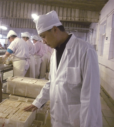 杨杰是该公司的一名普通职工,今年7月份,公司生产车间升级改造,上了一套新设备——自动翻块机。这个机器是该公司与机械厂共同研发的全国第一台自动翻块机,改变了一直以来人工翻腐乳块的工序。然而,虽是实现自动化了,但在人手上并没减少。