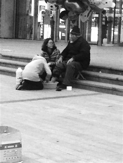 昨天下午4点30分左右,有网友发布微博称,朝阳区富力广场东侧,多名“好心人”自带水盆和热水,为广场上的小贩义务洗脚,随后未留下姓名匆匆而去,引市民网友称赞。记者走访后获知,至少有4女1男参与了这一活动,并自称献爱心,目前,这些“好心人”的具体身份尚不清楚。(12月7日《京华时报》)