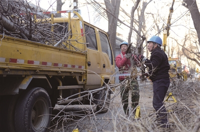 高处剪枝的人忙着,下边路面的职工也没闲着。十几个人从两头儿将胡同断行,以防砸伤行人。剪枝告一段落,立刻有几名职工上去将树枝捡到车上,保持路面整洁。几分钟就能装满一车枝杈。