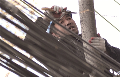 今年夏天,府学胡同、白米仓胡同、细管胡同陆续有居民打电话来反映,自家门前的电线,被疯长的白蜡树树枝划破绝缘皮,一到刮风下雨就擦出电火花,甚是吓人。