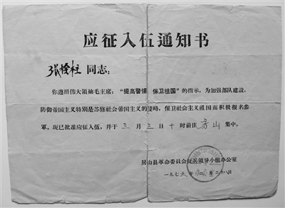 1976年初,我在房山县某单位工作时得知部队招兵的消息,就果断报了名。之所以报名参军,主要因为年轻,好男儿志在四方,去部队“大熔炉”锻炼锻炼总有好处。没想到体检、政审都合格,很快拿到了“应征入伍通知书”,而且当的是海军。“通知书”是张A4大小的浅黄纸(如图),上面印着“张栓柱同志:你遵照伟大领袖毛主席‘提高警惕、保卫祖国’的指示,为加强部队建设,防御帝国主义……”内容的文字。从这张“通知书”上不难看出,那个年代我国与美苏之间的关系,还十分紧张。