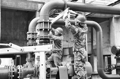 一层下面有地下室,是一个水池,一层每平方米的负载为2吨。吊装的管道每根长12米、重5吨,要上高空,采用8-12吨的吊车最适合。但由于一层下面是水池,如果吊车开上去,会把地面压坏。此时,若考虑铺钢板防护的办法,时间来不及加之成本高。因此,项目采取了利用力学原理进行的安装方法,用机械、滑轮、导链等将管道吊装上去。