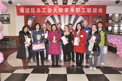 近日,31名大龄单身职工来到了海淀工人文化宫,参加了由海淀区总工会职业介绍所组织的“2014年大龄职工单身交友联谊会”活动,他们分别来自海淀区市政市容管理委员会、北下关街道办事处、海淀区城管监察局、北京滨松光子技术股份有限公司、北控捷通(北京)科技发展有限公司、用友软件,新奥特视频技术有限公司、北京双杰电气股份有限公司、甘家口大厦、海淀劳动仲裁等15家单位。年龄最大的47岁,最小的32岁,活动现场通过成语接龙、枣结良缘、穿针引线等互动游戏,使他们很快不再拘谨,当场有6对互有好感,愿意会后进一步了解。