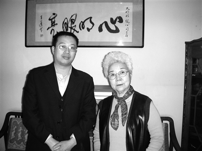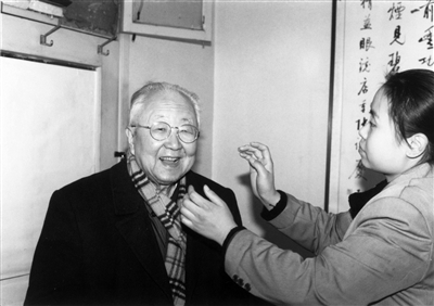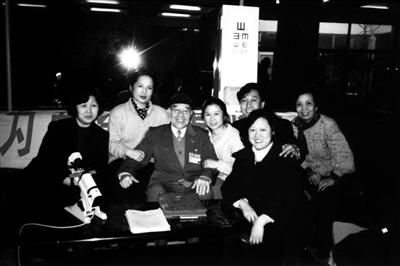 我的工作需要为每张相片做注解,其中有两张相片中的名人不知道是谁,这两张相片的拍摄时间应是上世纪八九十年代,一张中有大明六位“老”职工围着一个坐在沙发上精神矍铄的老者,我看老者像金铁霖教授,我就写为“金铁霖教授在代表驻地与大明服务人员合影”,但是有人说这人是京剧大师袁世海,我百度了一下网上袁世海先生的相片,与现有的相片进行了比对,在老者右侧眉毛的左上方靠近额头中间的部位都有一个明显的痦子。由此确定这就是袁世海先生。另一张是戴着试戴镜架的老人的相片,原来的前辈们留下的文字说是书法大师启功配镜时照的相片,但是相片中没有大明的职工,这个人到底是不是启功大师呢?启功先生的确认,得益于办公室朱瑞芬主任的另两张相片,这两张相片中都有启功先生。老先生戴着眼镜,鹤发童颜,很多人一下就能确认是启功先生。朱主任说:“这是我刚参加工作不久,启功先生来北京精益眼镜(后来的大明眼镜精益店)配镜时照的。启功先生非常和蔼可亲,第一次给这么有名的人验光,我有些紧张,怕验不好,但是老先生特别友好,还鼓励我,后来拿到眼镜后又向我表示感谢。”朱主任高兴地“贡献”了她与启功大师合影的相片。