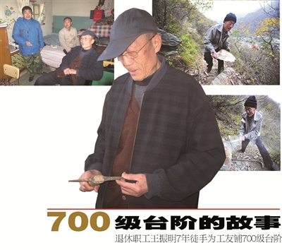 2004年,已年过古稀退休在家的王振明,患上了脑血管疾病,为了锻炼身体,他坚持每天到山上转悠。他看到了不少工友还是像以前一样爬山上班,上山下山非常不方便。为了改变行路难的状况,王振明心里做出一个决定:修山路。