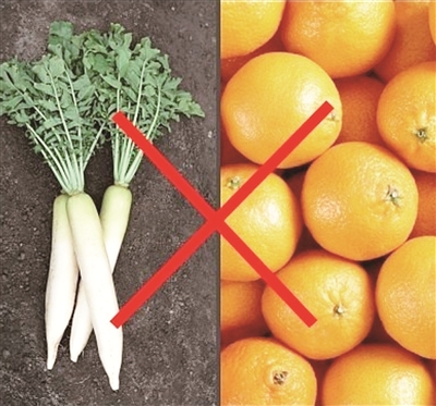 萝卜忌与胡萝卜同时吃,萝卜主泻、胡萝卜为补,二者最好不要同时食用。萝卜忌与橘子等水果一起吃。萝卜会产生一种抗甲状腺的物质硫氰酸,如果同时食用大量的橘子、苹果、葡萄等水果,水果中的类黄酮物质在肠道经细菌分解后就会转化为抑制甲状腺作用的硫氰酸,进而诱发甲状腺肿大。