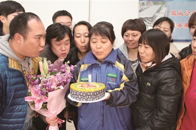 2014年即将过去,快速公交2线东大桥站站长艾平迎来了自己第50个生日,同时她也将光荣地退休,车队把即将接替她的站长、以及她的徒弟刘胤和其他站长一起召集到车队会议室,为艾平举行了一个简单而又意义不同的生日庆祝仪式,大家把多年来对她工作的认可和朋友间的感情作了回忆,仪式充满了浓浓的情谊。自2008年快速公交2线开线至今,艾平作为站长,团结带领本站的站务员,取得了极大的业绩,奥运会后获得了公交集团授予的集体荣誉。