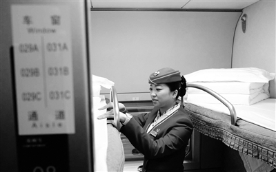 据1号车厢乘务员陈圆介绍,高铁动卧共16节车厢,除去车头车尾配备两节二等座车厢及中部的8号餐车外,其余全部是动卧车厢。