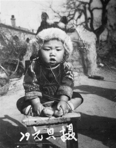 弟弟照这张时,父亲一定是下了很大的决心,母亲翻出过年时才让穿的衣服,特意把他打扮了一番。头上戴了一顶小虎帽,穿上绣着百家锁的小花衣。也不知什么原因,没有穿鞋,大概是旧鞋太旧,新鞋还没做好,或者压根还没有给不会走路的他准备鞋。裤子也有点短,露出小腿。估计他嫌冷,两只胖嘟嘟的小手,紧紧抠着棉袜。当时,他还坐不稳,那张椅子有些破旧,也还有些摇晃。一开始,摄影师让母亲蹲在椅子后,从后面稳住他,但估计嫌镜头不好看,就让母亲离开,说也就几秒钟的时间,掉不下来。估计弟弟也害怕把自己掉下来,张着嘴巴,似乎还有哈喇子从嘴角流下……照片洗出来后,看到弟弟憨态可掬的样子,大家都笑称他“憨娃”。