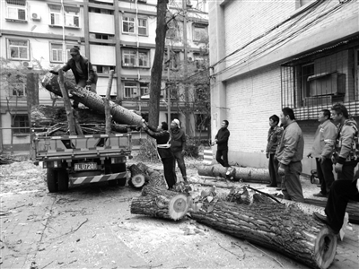 朝阳区祁家豁子社区黄楼大院是一个50年代建起的居民大院,当时院里门前种植的杨树,也早已长得与楼同高,几十年的老杨树从未修剪过。自2007年起至今在大风大雨中已刮倒了20余棵,幸好倒后没有砸伤人,而仅仅是砸毁了房屋、门窗、护栏、电线、车辆……