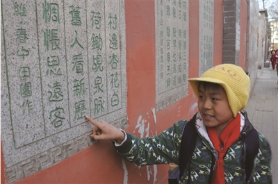 12月8日,山西太原桃园南路西里街,刻有近百首唐诗的文化墙上,繁体字错用竟有33处之多,被网友称为“尴尬文化墙”。图为文化墙上王维《春中田园作》中的“舊人看新歴”诗句,“暦”字错用为“歴”。