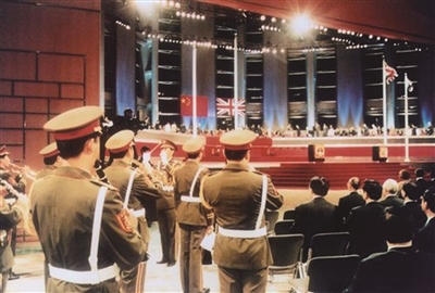 激动人心的政权交接仪式开始了。二十三点五十九分,英国乐队开始演奏《上帝保佑女王》,降英国国旗。“正常情况下,英国国歌需要五十多秒,可是他们一演奏我就觉得不对劲,节奏比平时还快了不少。结果,他们只用了三十多秒就演奏完了。我们只做了英方如果拖延时间,我方坚决按时奏响的准备,没想到他们会加速演奏。”