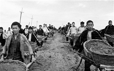 1950年10月14日,当时的政务院发布《关于治理淮河的决定》,制定了上中下游按不同情况实施蓄泄兼筹的方针。新中国水利建设事业的第一个大工程拉开了帷幕。淮河沿岸各级政府积极响应,组织民工参加治淮工程。这是民工在河南省禹县白沙水库工地运送土石。
