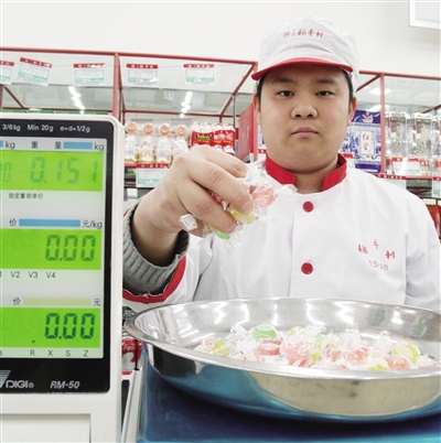 张秉贵的“一抓准”是卖糖果时,顾客要半斤,他能抓准分量,一手便能抓出5两。在熙熙攘攘的稻香村花市店,记者在卖糖果的现场看到,洪海粟抓了一把糖果,应该是3两,也就是150克,放上一称,电子秤的显示屏上显示是151克,多了1克。不准呀?他拿下一块糖果,秤显示是146克,还是不准呀?经理王辉告诉记者,现在的糖果分量不十分精确,这已经达到了技能比赛的要求了。