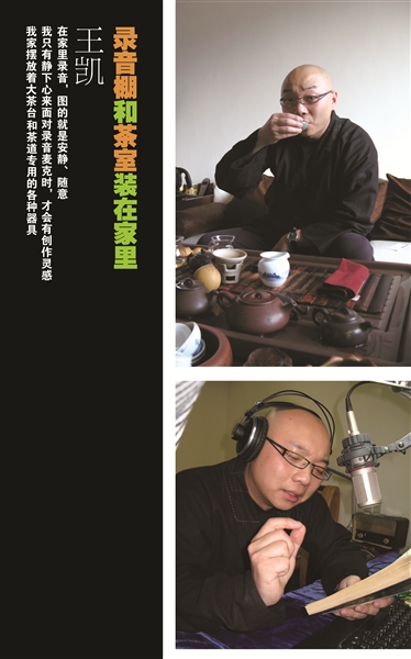 走进王凯的家,给人感觉很舒适,装修简约、经典,文化气息很浓,是两百多平方米的复式结构,宽敞舒适。客厅最显眼的位置摆放一个很大的茶台,茶台上面非常有序地摆放着泡各种茶专用的紫砂壶和茶道专用的各种器具。王凯最得意的就是把二楼的卧室精装成他最衷情的自制录音棚,王凯大部分录音作品都出自于此,虽说,录音设备不算很昂贵,但效果极佳。王凯告诉记者:“在家里录音,图的就是安静、随意,可以选择自己状态最好的时候随时录音,累了的时候坐在茶台旁,静静地品品茶,尽情放松一下自己。我生活中最大的爱好就是扮演声音王国的各种角色。”