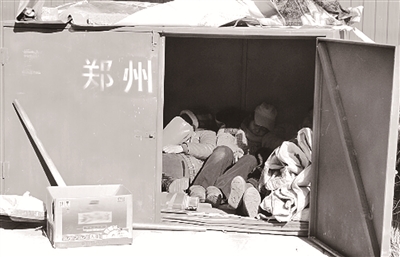 12月21日中午12点,河南郑州西三环与长江路口附近,5名女环卫工由于中午休息时间短无法回家,而附近又没有休息室,就挤进一个垃圾箱中歇息。(12月22日《河南商报》)