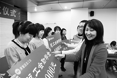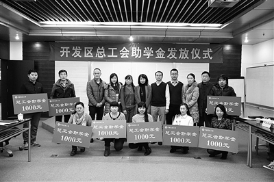 “在2014年即将结束之际,我们的同学也迎来了这个好日子——此次开发区总工会为我们的学生发放助学金,每人1000元,这次符合条件,得到助学金的同学共有66人。 我们非常感谢总工会对职工教育的支持,感谢总工会为我们提供了优良的教学场所,阶梯教室、计算机网络教室、阅览室等等。”朱小清主任表示,有了总工会的支持,我们会更加努力。