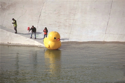 12月12日,河南淅川陶岔渠首闸门升起,南水北调正式供水。在南水北调中线工程通水现场一“大黄鸭”被放入水中,据了解,“大黄鸭”身上配有GPRS和摄像头等设备,工作人员称可以大概估算出水流的速度。此事一出,遭不少网友吐槽“难道专家以为不刮风么?” 据现场工作人员预计,“按照目前的速度,丹江水15天左右将达到北京。”