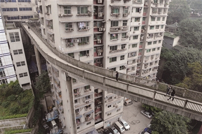 在重庆渝中区解放碑左营街大阳沟派出所与鑫龙大厦之间,有一条可通往新华路的人行天桥。记者目测,这座天桥距离地面约40米,桥面宽约2米,长约30米左右。桥身一端位于大阳沟派出所一侧的地面,而桥的另一端则直接与鑫龙花园A栋13楼相接。据附近居民王女士说,为了方便上班,有许多市民从这里经过。