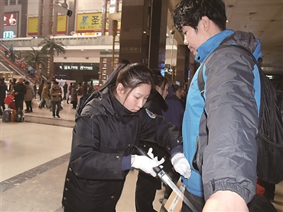 郭明津说:“我们属于北京站派出所管理,他们每天三班倒,每班有十几人,24小时都在安检。”记者看到,一会儿郭明津站着熟练地对每位旅客进行全身的检查,仔细观察着每一个经过扫描安检处理的包裹。有一个包裹有异常情况。她将这个包裹拿出来,把这个包裹的所有人叫到跟前询问,包裹有什么东西?打开包裹查看,确实发现了违禁物品。