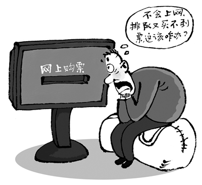 为了买到过年回家的火车票,广州的装修工人游云一家费尽了力气。他儿子和媳妇略懂电脑操作,2人同时用家里的两台电脑在12306网站上“抢票”,均未能得手。对电脑一窍不通的游云则试图去火车票代售点碰碰运气,也未能如愿。对网络并不熟悉的游云们,被数码门槛挡住了回家之路。(12月28日 财新网)