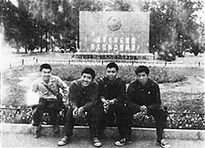 不知什么时候,空地的南边种了一些树木和花草,并没有假山亭台楼阁之类的,假山是后来堆积的。1968年,文化大革命正在如火如荼地进行,但中学生们已经无所事事。有一天中午,在学校吃完午饭,四五个同学一商量去西山的八大处公园玩,于是就动身前往。那时候交通很快捷,虽然八大处远在西郊,我们从崇文区的培新街出发,坐的什么车都忘了,只记得倒了两次车就到了,八大处空空荡荡的,几乎不见游人。叫“八大处”,是因为这片山上有八个寺庙而得名,我们爬了一会儿山,在一个寺庙处喝了一壶茶就往回返,到了东单时才黄昏。余兴未尽,就在东门口照了这张照片。背后有一个大标语牌,上面画着毛主席像,写的是:高举毛泽东思想伟大红旗奋勇前进,反映了当时的历史风貌。