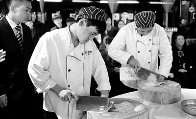 “哒哒哒……”随着主持人一声令下,3个选手拿起土豆,不慌不忙地先切成片,码齐,密集而匀速的切丝声随后响起,现场顿时爆发出热烈的鼓掌加油声。2014年12月30日上午,亚运村街道首届“慧心杯”非公餐饮企业劳动技能大赛在黑土印象饭店举办,13家企业的60余名职工参赛。刀功组比拼的是切土豆丝,选手们精湛的技艺“引爆”赛场气氛。