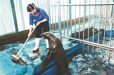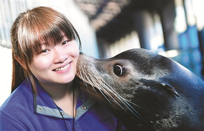 驯养师名叫李沛莹,2009年应聘来到海洋馆,开始了与海洋动物打交道的日子。性格活泼、开朗的她,现在负责馆内所有表演海狮的喂养和训练工作。