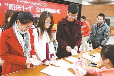 昨天,苏宁云商集团股份有限公司北京苏宁联合中国政法大学“阳光照亮回家路·送500名贫困学子回家过年”公益活动启动。在活动现场,中国政法大学500名贫困大学生拿到了春节回家的“路费”。北京苏宁全体员工每年都会将自己的一天工资捐献给“苏宁阳光1+1公益基金”,用于社会公益事业。此项基金已设立9年,捐款近百万元,为贫困学子补贴春节返乡车费,先后有5000多名贫困大学生圆了春节回家过年的团圆梦。
