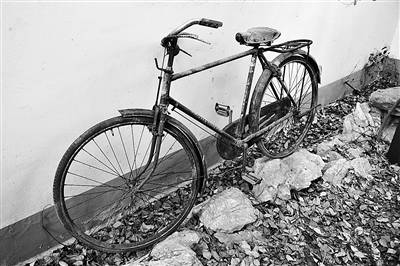 称那辆自行车为“老爷车”其实一点儿也不为过,没有脚蹬,固定脚蹬的铁轴被磨得光亮;没有刹车,也没有前轮挡泥板,制动时只能伸出左脚用力踩前轮……我曾试着骑过,刚上去就险些摔下来,因为车把很不灵活,稍转动还有“咯吱吱”的响声。