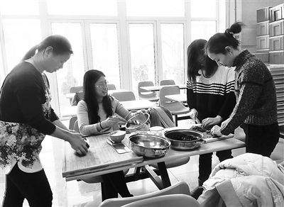“最近感冒的人特别多,可以多吃一点增加抵抗力的食物,比如白萝卜、香菇、木耳之类。”会计张继红忙着烧水,不时说上几句养生注意事项。她说,前阵子很多教师咳嗽,社团还教大家蒸橙子吃,减轻症状。她的女儿在一边玩耍,等着吃完饺子再回家。