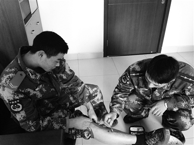 “报告,有战士受伤了。”一班班长报告贾砺。一名小战士被铁梯磕伤了腿,他把裤子卷起,记者看到他的小腿上磕破了两个血口,贾砺连忙领着他回到办公室擦了碘伏并贴上创可贴。“爬铁梯很容易受伤,磕一下就是一个口子。”
