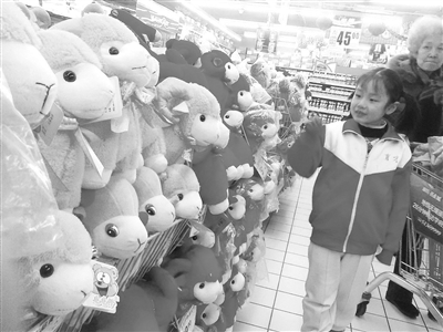 虽然距离农历羊年春节还有将近一个月的时间,但是在一些批发市场和超市里跟“羊”有关的年货已经成为抢手货,受到不少市民的青睐。在某超市的玩具区,“吉羊”窗花和五颜六色的毛绒羊玩偶被放在了最打眼的位置上,“大约每天都能卖出七八十只”,一名补货的售货员告诉记者。本报记者 于佳 摄影报道