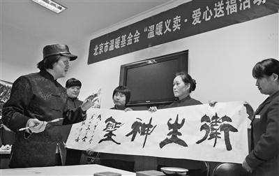 下午两点,西城区环境卫生服务中心一层,10多位书画家挥毫泼墨,一张张圆润饱满的“福”字,一幅幅隽永的花鸟山水画,从书画家的笔端倾泻而出,引来围观环卫职工的啧啧称赞。