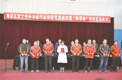 近日,北京市海淀区职工技术协会在北京北冶功能材料有限公司文体中心,组织举办了海淀区职工技协冶金行业技能竞赛颁奖暨“师带徒”活动启动仪式。会上,宣布了12名竞赛优胜奖获奖名单;来自翠微大厦股份有限公司、北京昊海建设有限公司、北京北冶功能材料有限公司、北京海开房地产集团有限公司的8对师徒代表现场签订了“师带徒”协议书。