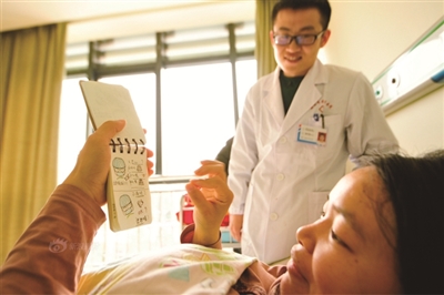 1月7日,湖南省荣军医院,助理麻醉师姚翔用随身携带的速写本与聋哑产妇小娟交流。当时在医院剖腹产的小娟是聋哑人,为了方便医患沟通,也让产妇放松压力,姚翔特地将手术流程生动的画在纸上。后来小娟产下了一个小男孩,母子平安。姚翔去年刚从长沙医学院毕业,一直爱好美术,这次看到自己的画能让病人放松,他十分高兴。