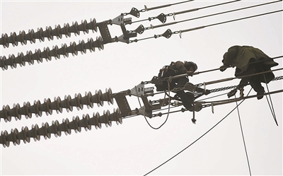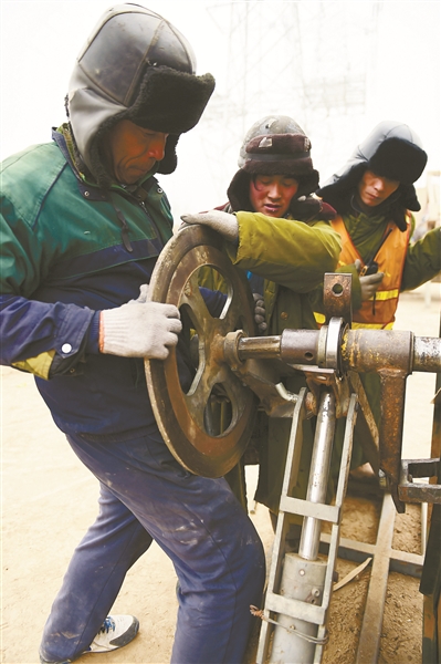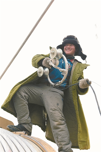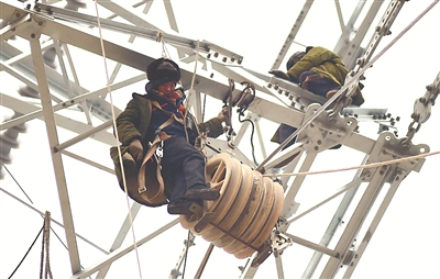 1月15日一大早,在朝阳区金盏乡的一个电力工程工地上,25岁的李海波穿上了最御寒的绿色军大衣,开始做上线前的准备工作。系好一长一短两条安全带,戴好安全帽,李海波麻利地爬上了耐张塔,今天的塔不是很高,大概60米左右,这对李海波来说没有什么挑战。