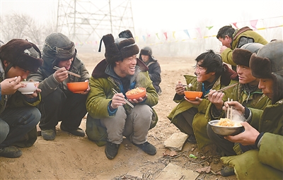 中午11点半,工地送来了盒饭。工友们凑在一起,就坐在工地一旁吃起来。尽管饭菜很热,因为天气冷又有风,还没吃完饭菜就凉了。所以,工人们都养成了吃饭快的习惯,一是想多吃几口热乎的,再是他们惦记着还有活儿在等着……
