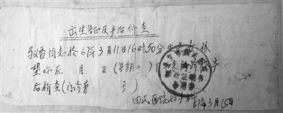 严格来说,这张出生证明只是一张便条。它长18公分,宽7公分,纸质粗糙,颜色发黄,钢板蜡纸印出来的字非常随意,内容也极其简单,除产妇姓名,婴儿出生时间和性别外,其他如婴儿的体重、身高、血型、发育状况等等全没有记录,甚至连产妇门诊号、婴儿编号、医生姓名等都没有记载。比起当今医院出生证明的严肃庄重、内容详细、外表美观漂亮真是天壤之别。尽管如此,它毕竟是女儿诞生的依据,记录了她来到这个世界的时间和地点,几十年前能有这样一张证明已经很不错了。