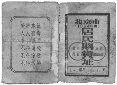 这张1964年度《北京市居民购货证》为白绵纸黑字, 尺寸为6cm×10cm,封面盖有北京市商业局和北京市副食品商业局两枚印章,购货证封底写着爱护本证人人有责,妥善保管不得遗失,不得涂改不得污染。