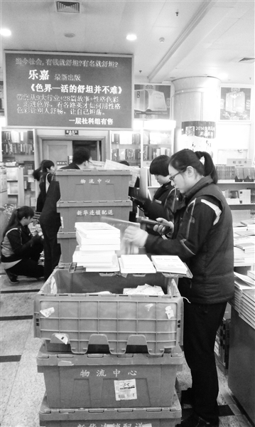 刘颖、杨阳和刘灏熟练地将收货车依次摆放在箱子周围,然后开始完成“收货”。手持机对准箱子外侧贴着的条形码一扫,然后打开箱子拿出一张粉色的发货单,再用手持机扫图书背后的条形码核对数量、最后放入收货车……书店一层的9位营业员,紧张而有序地操作着。