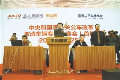 昨天下午, 首批国家和中央机关取消的公务用车在北京亚运村汽车交易市场拍卖。首场拍卖的106辆公务用车,吸引了众多的竞拍者。据了解,此次拍卖实行车牌分离,参与竞拍的车辆车牌号将被交管部门回收。因此,如所购车辆在北京市本市过户,购买人须持有北京市小客车配置(或更新)指标。现场252号举牌拍得中央公车第一车。该车起拍价为4.9万元,最终以6.1万元的价格成交,型号为大众帕萨特。本报实习生 张起晨 摄影报道