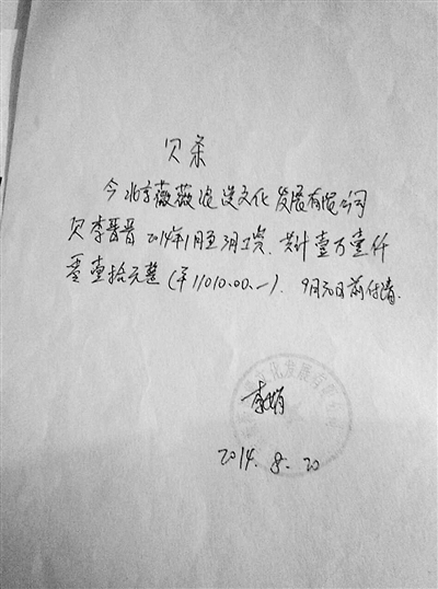 记者在李晋晋递过来的欠条上看到如下内容:“今北京薇薇浪漫文化发展有限公司欠李晋晋2014年1月至3月工资,共计11010元整,9月30日前付清。”欠条上有李经理的签字,并加盖了公司公章。