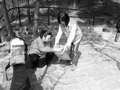 阚慧娟说,下山时她和同事眼睛盯着脚下及台阶旁的树根、草丛,凡看见矿泉水瓶、烟头儿、餐巾纸、小食品塑料包装袋等垃圾,就分类装在不同的垃圾袋中。沿路捡的垃圾有烟头儿、纸巾、冰棍包装纸、果皮等,矿泉水瓶很少,因为这个能卖钱,公园里有专门捡的人,所以她只捡到几个。工会这次组织的“低碳环保登山比赛”,让她受益匪浅。