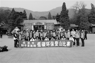 去年4月12日星期六,北京市和平里医院工会组织职工在香山公园进行了一次没有任何物质奖励的“低碳环保登山比赛”活动。尽管那次活动已经过去了9个多月,但是在和平里医院,每当谈起这次登山及捡拾沿途烟头儿、废纸等垃圾的工会活动,许多职工仍然很兴奋,说个不停。