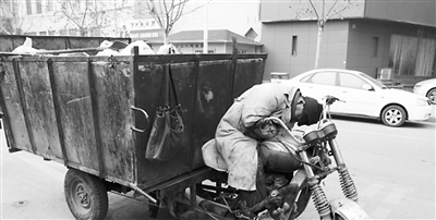 昨天上午,郑州一环卫工人骑机动三轮车清运垃圾,因工作劳累,等直行车辆时,在马路中间趴在车把上睡着了。事发郑州金水路与杜岭街交叉口,据目击者说,睡熟的男子大概40岁。(2月3日《河南商报》)