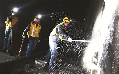 当走到离隧道口1800米处时,桥隧工们停下了脚步,孙镇指着墙壁上的冰块说:“从这块开始,渗水点就比较多了。”记者看到在墙壁上、地面上以及拱顶上“贴”满了冰块,由于这些冰块都是由山里的地下水形成的,所以显得格外剔透晶莹。如果这些冰在外面真的不失为一道美景,但在这里却是悬在过往列车头顶的达摩克利斯之剑。“在这个隧道里我们见过最大的冰锥足有人的大腿粗细,一旦砸到客车上,后果不堪设想。”孙镇说。由于云彩岭隧道渗水点很多,他们每天需要在这里一早一晚两次清除冰锥,再加上清除编号108隧道的冰锥,光行走的路程,每天都要近三十公里。
